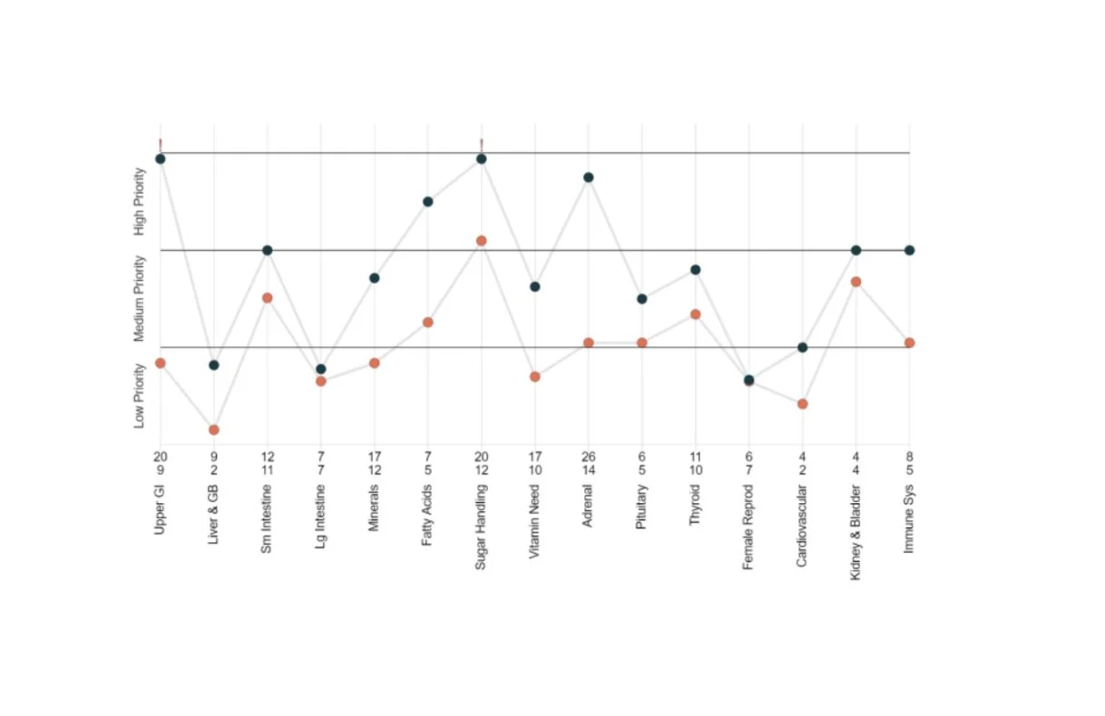 The nuts and bolts of the comprehensive analysis include a symptom burden graph that is done via a questionnaire that is completed by you throughout your journey. Its main job is to identify any possible imbalances.